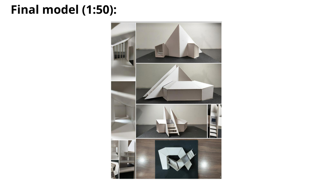 Throughout this project, I was able to create the model's design of form and shape by understanding the design narration through the user's spatial experience, and the human anthropometrics and ergonomics. I have also tested the properties and constructability of preferred materials for my tectonic structure.